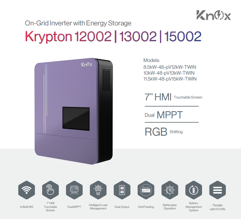 The Krypton Eco 12002, 13002, and 15002 On-Grid Inverters are next-generation solar inverters engineered for high-capacity energy solutions. With power ratings from 8.5kW to 11.5kW, they deliver superior efficiency, intelligent energy distribution, and seamless integration with modern solar setups.
